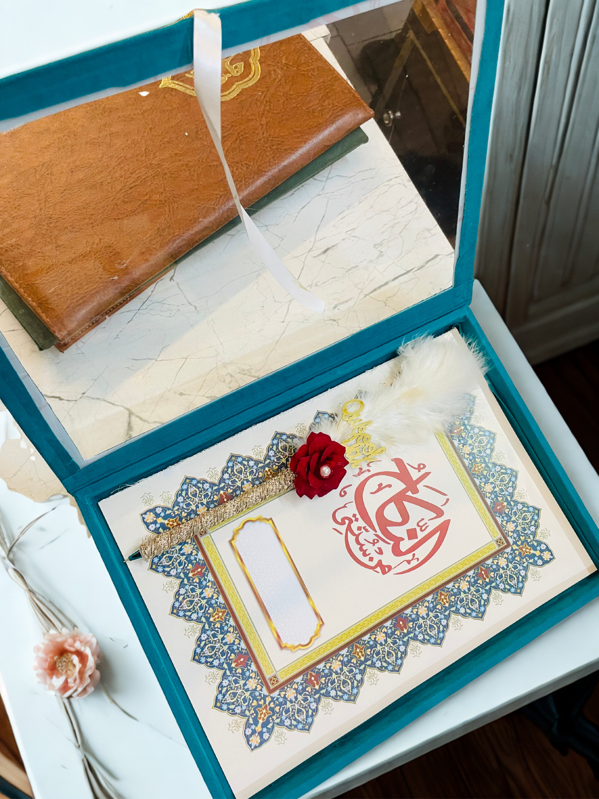 Encased in a glass box frame with a velvet finish, the design features intricate Islamic geometric patterns, gold foil detailing, and a special customizable section for your names and Nikah date. The decorative elements — including a red rose, gold key charm, and soft white feather — add a touch of romance and sophistication.
