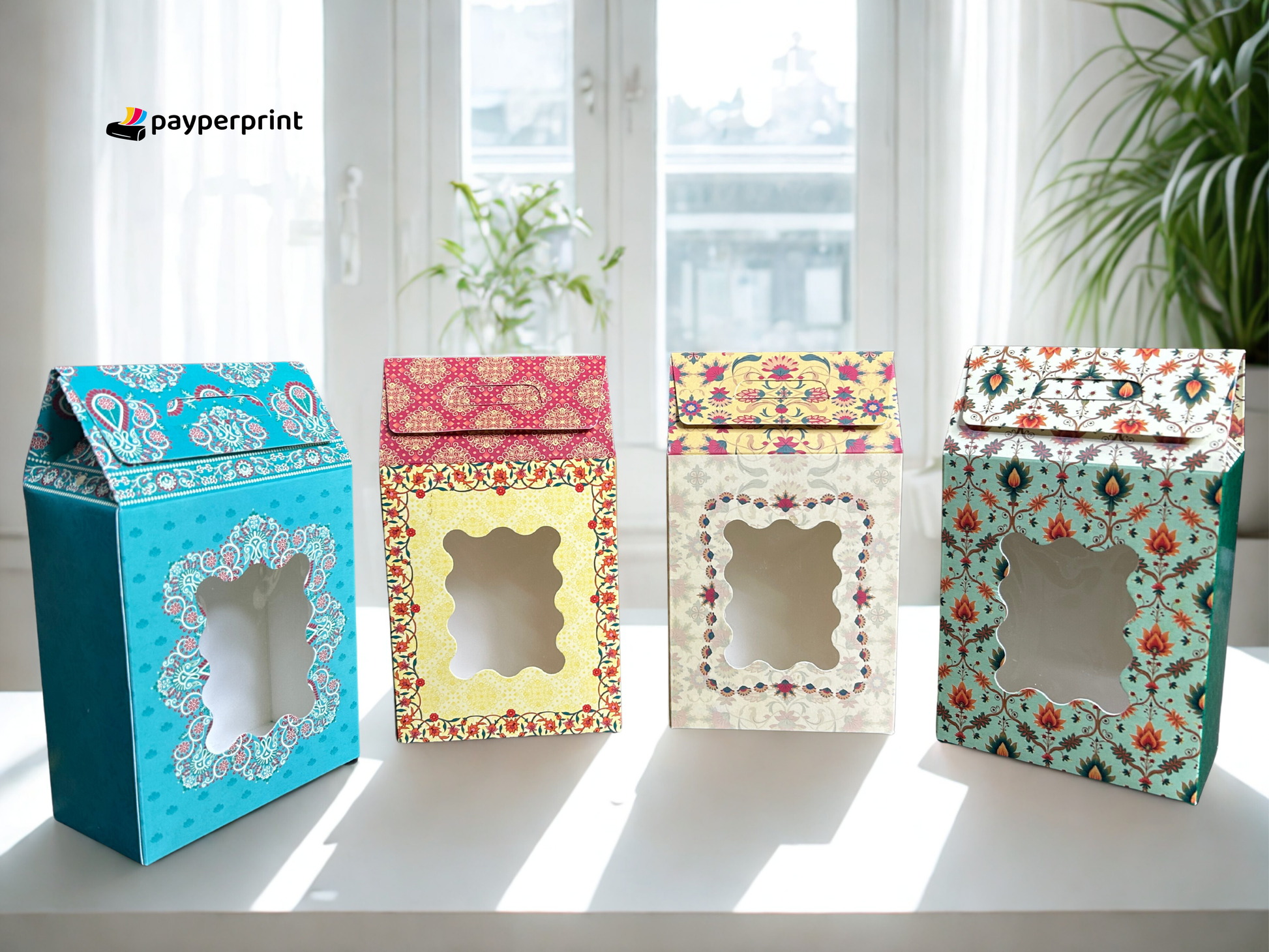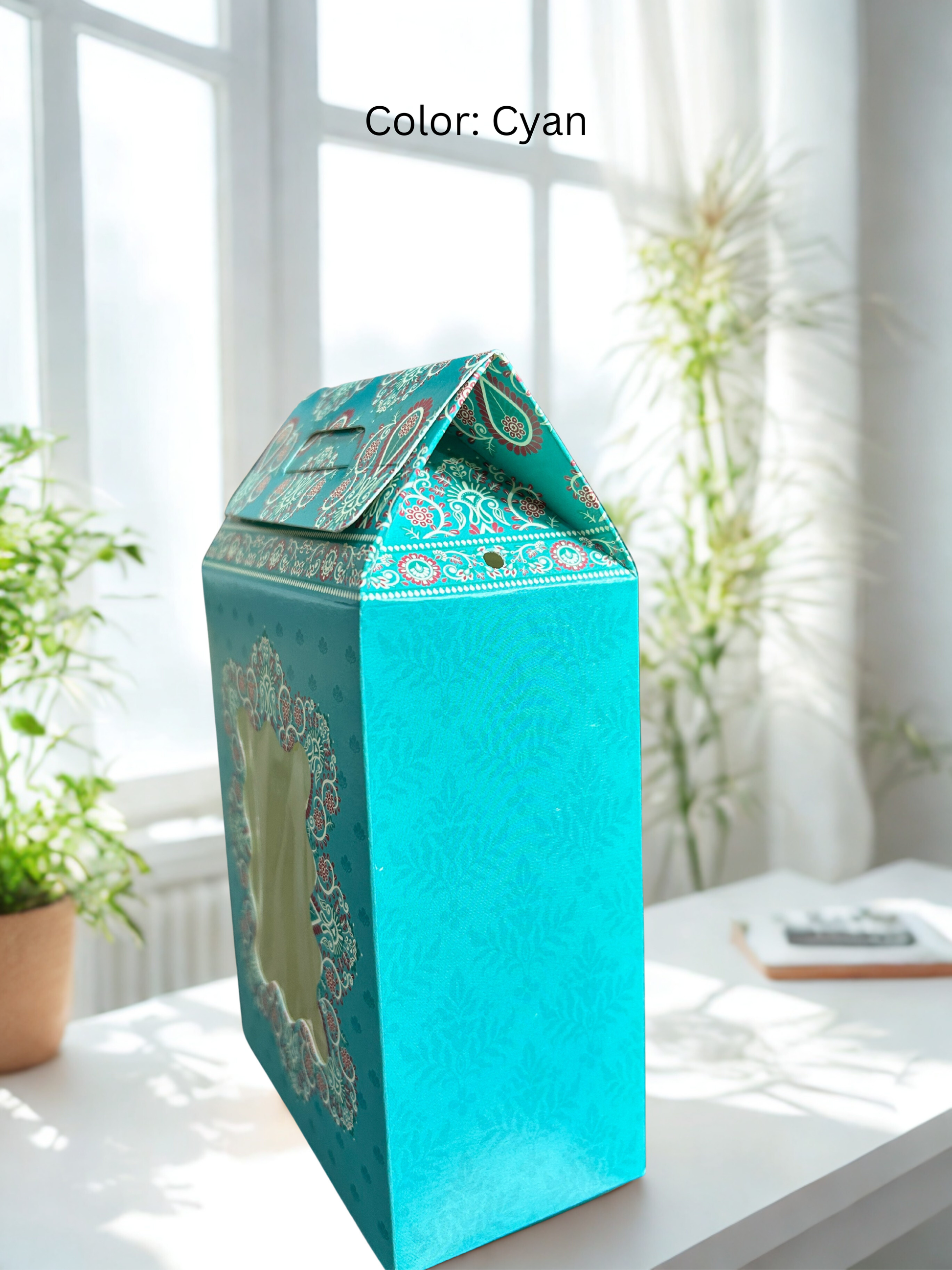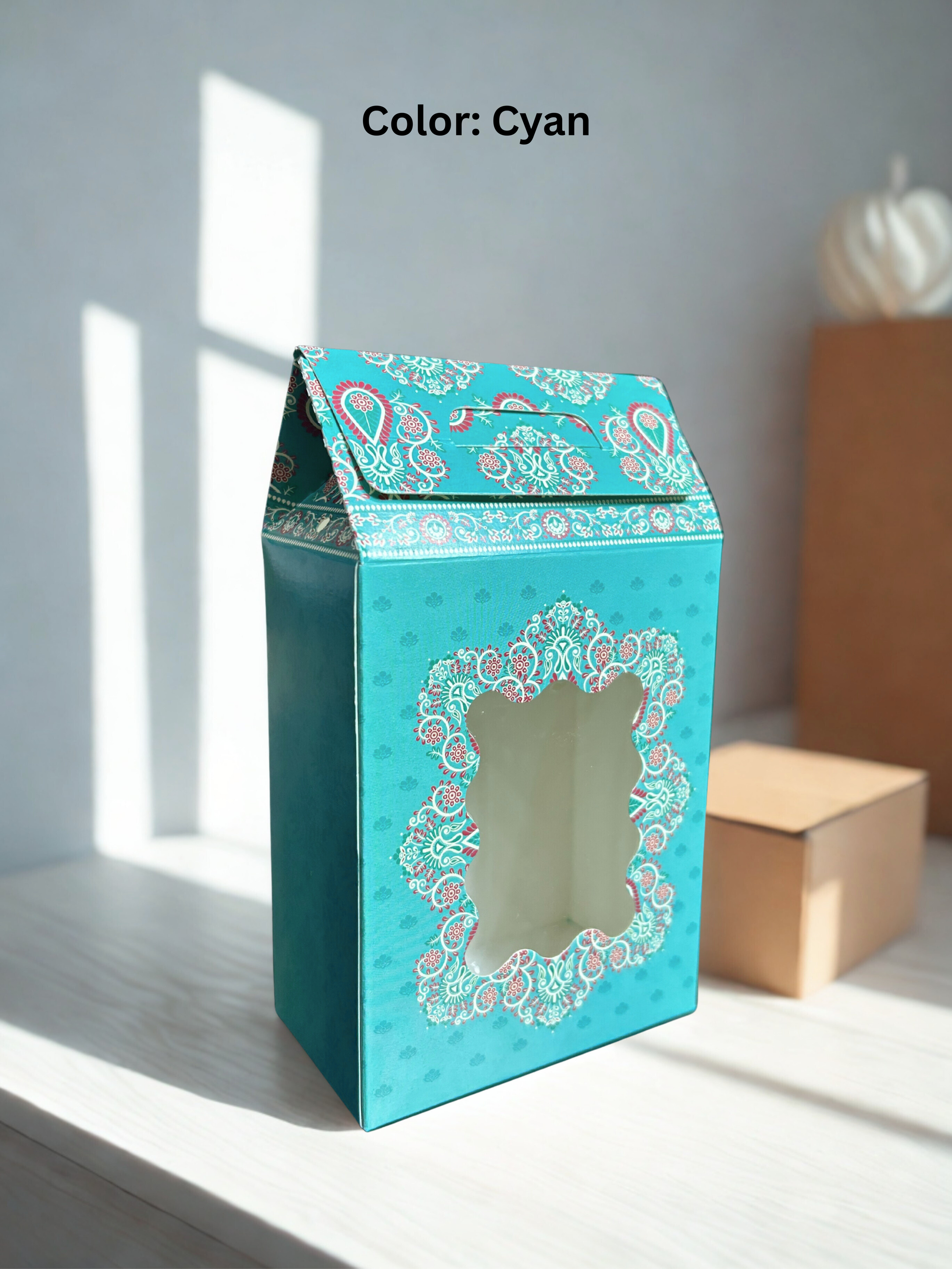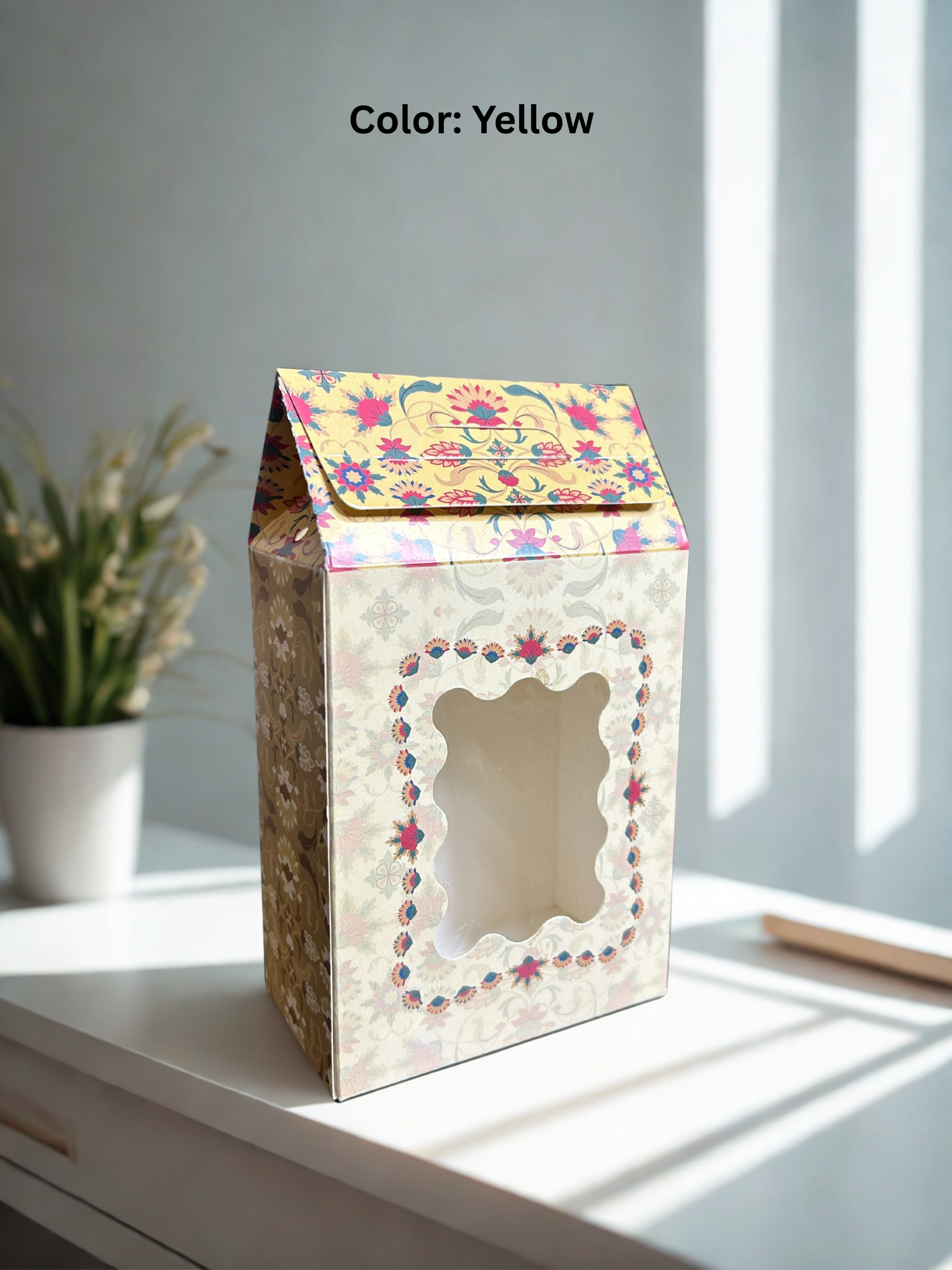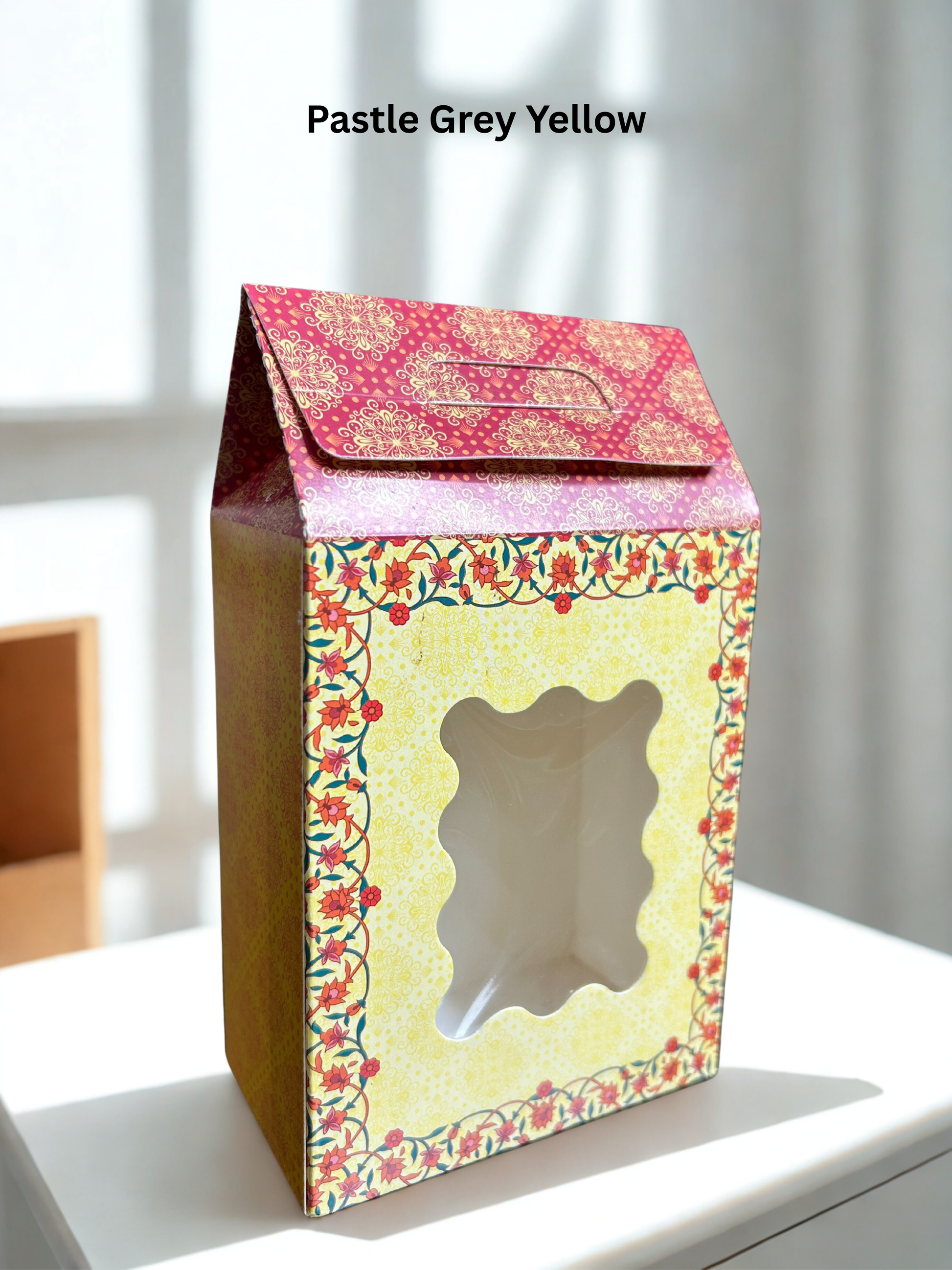 Designed with a decorative cut-out window and intricate printed detailing, these boxes are perfect for showcasing sweets, favors, dry fruits, candles, and small gifts.