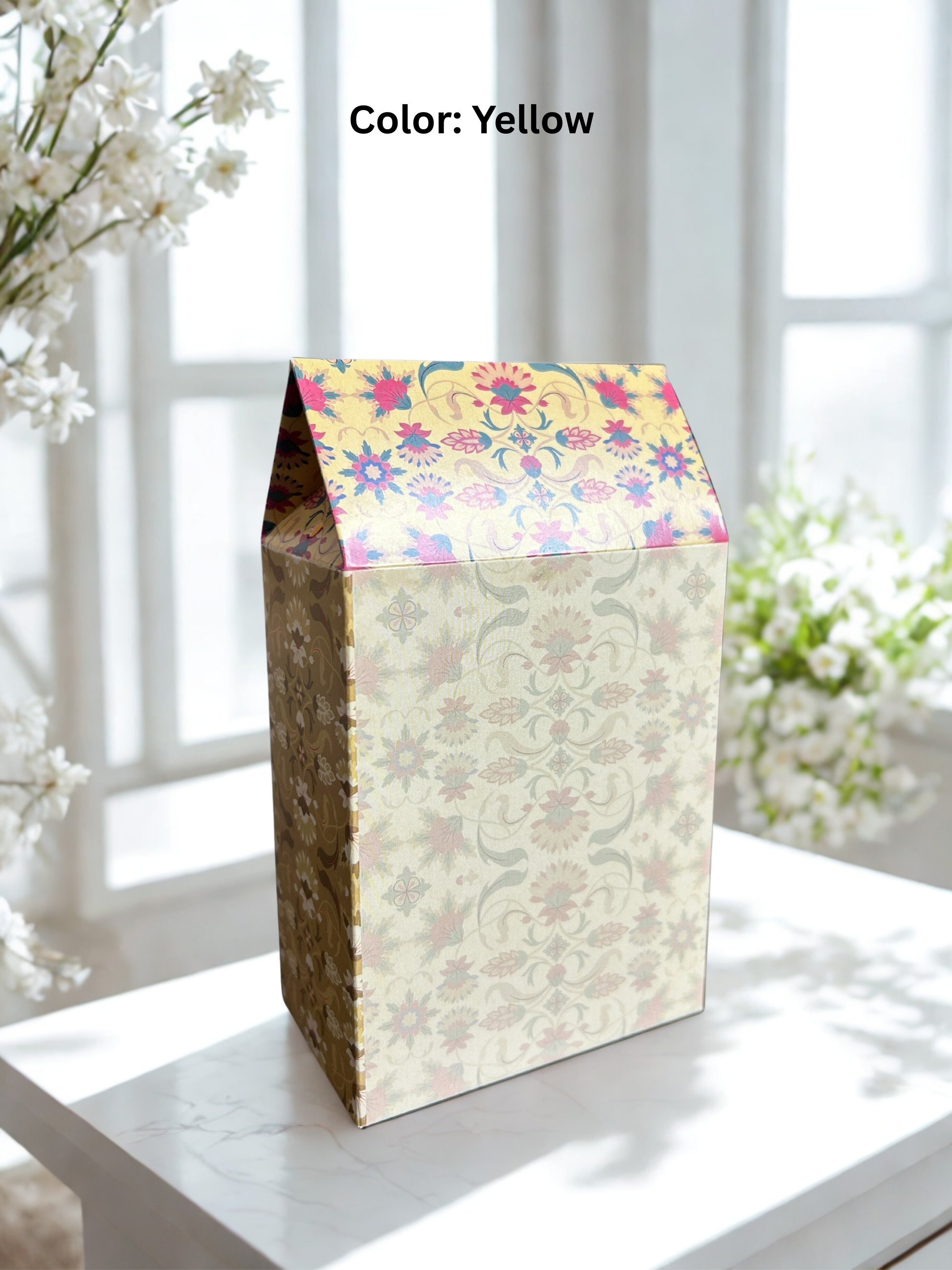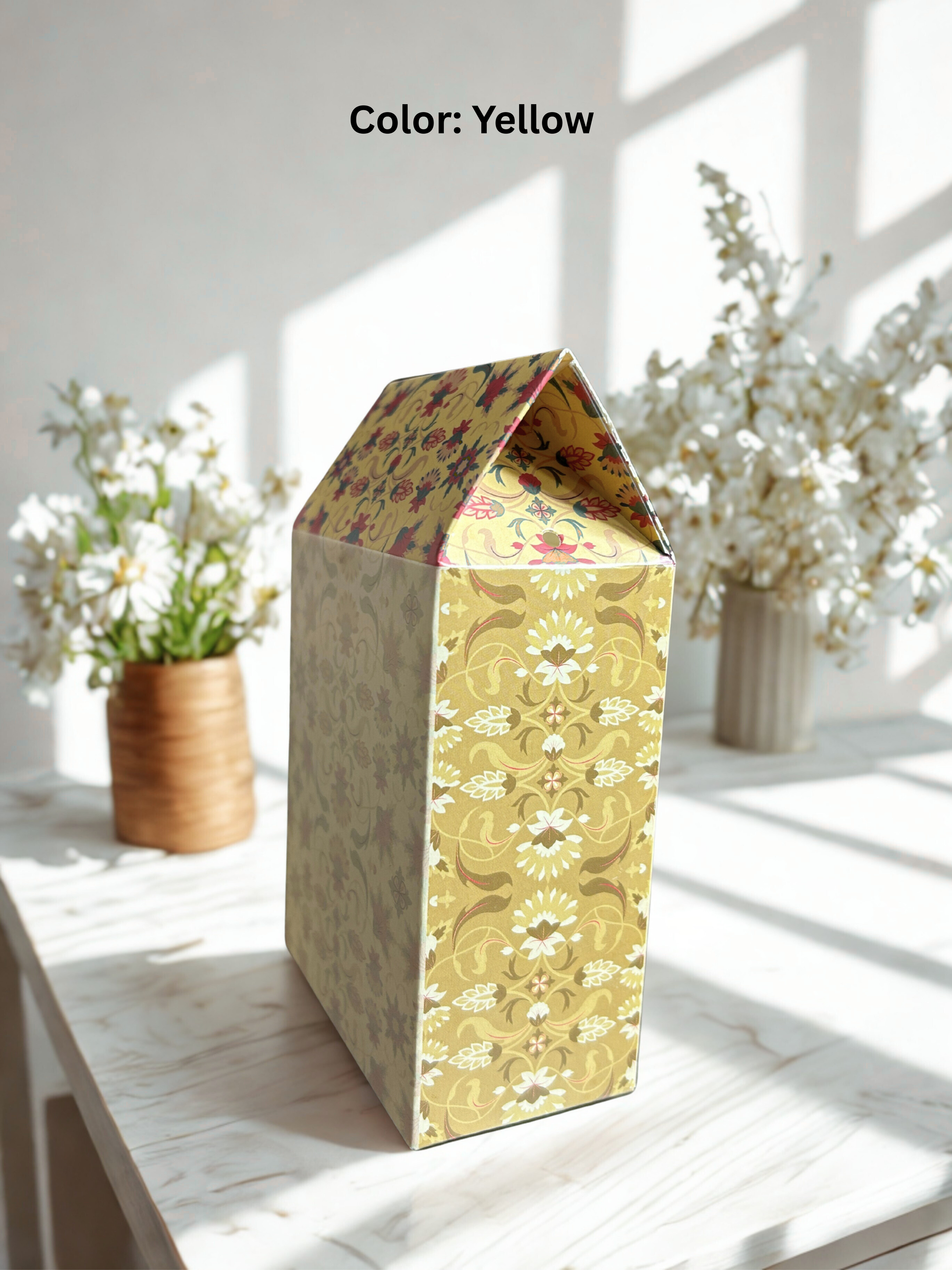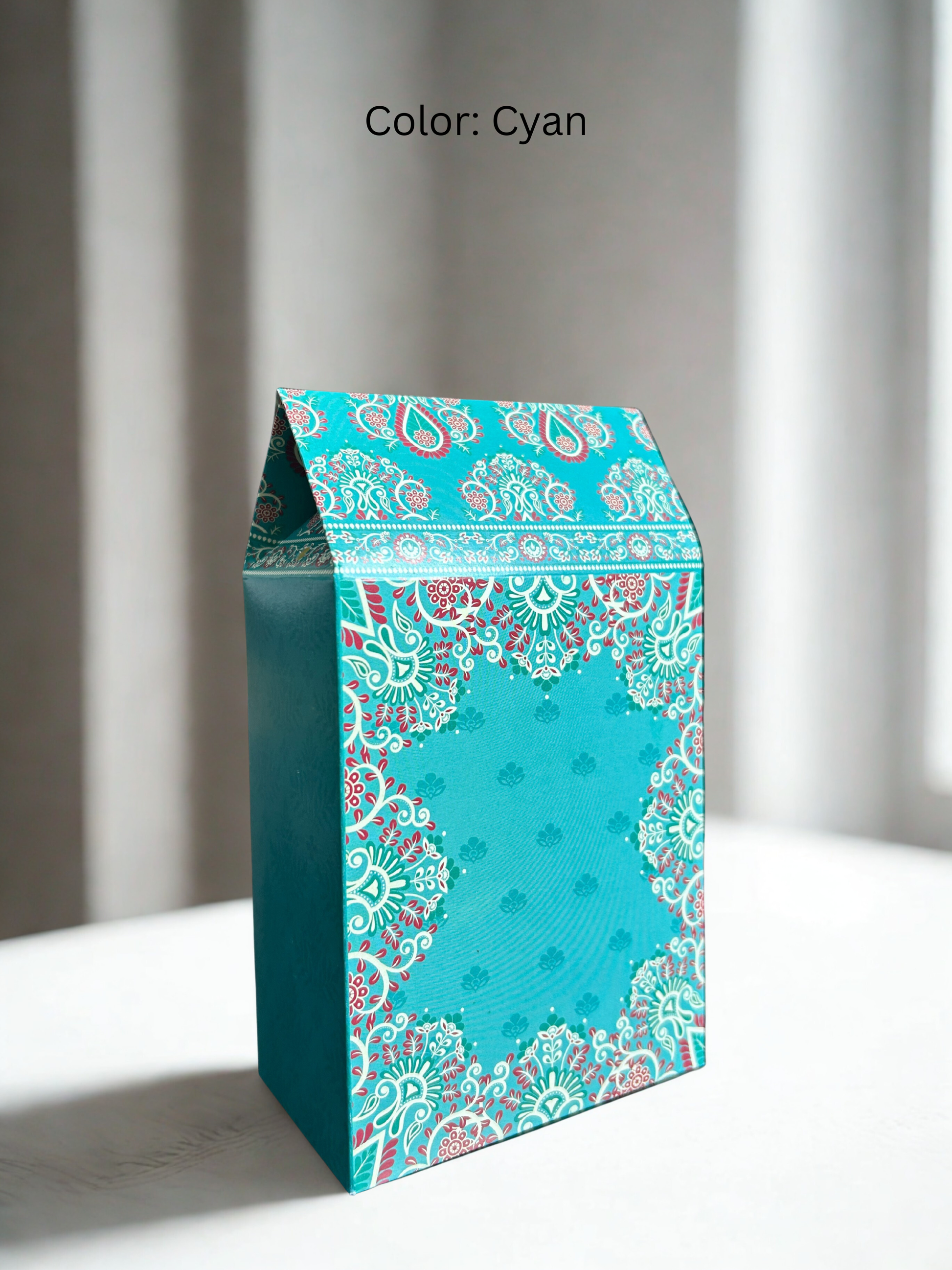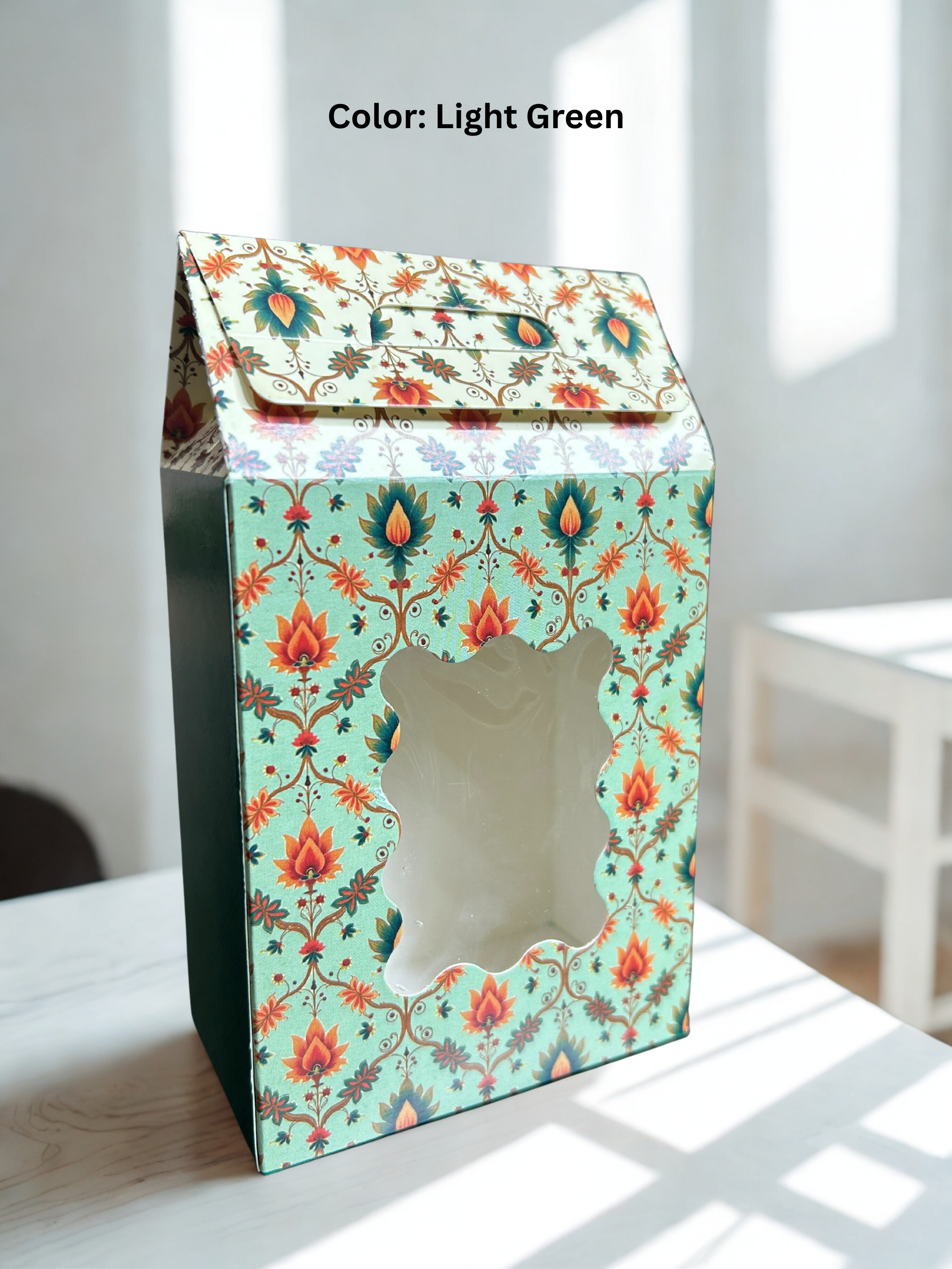 Designed with a decorative cut-out window and intricate printed detailing, these boxes are perfect for showcasing sweets, favors, dry fruits, candles, and small gifts.