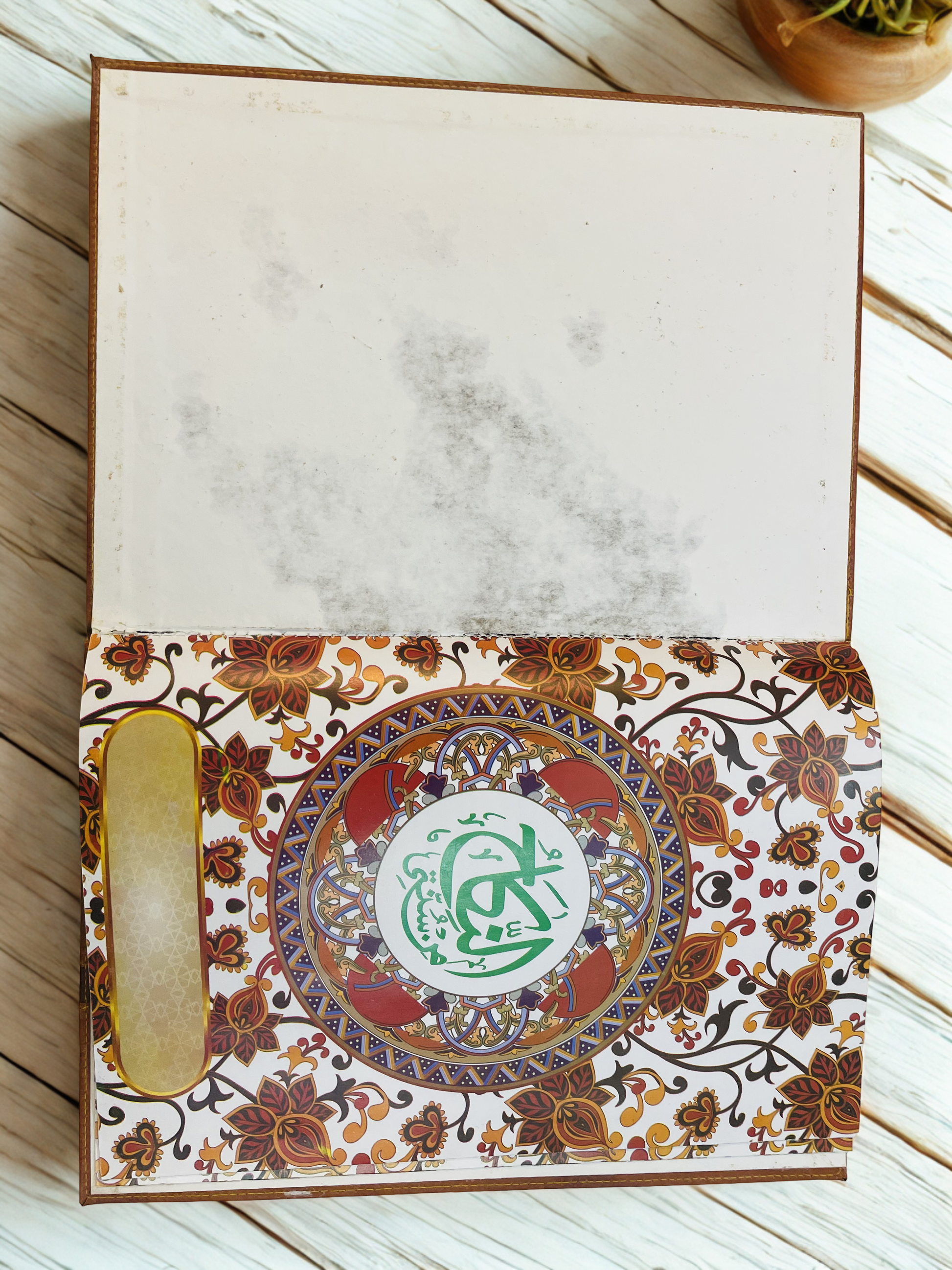 🌙 Islamic Embellishments: Gold foil details including intricate floral or calligraphic motifs (e.g., "Bismillah" or decorative monogram).